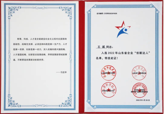 2022-11-24 祝贺山东健源生物董事长王诚荣获2022年山东省企业“创新达人”称号