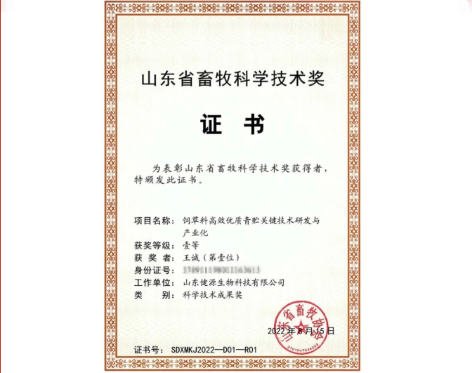 2022-8-17 【喜报】山东健源生物荣获山东省畜牧科学技术奖一等奖
