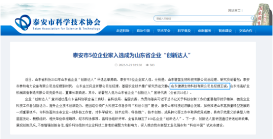 2022-10-5 山东健源生物董事长王诚荣获2022山东省企业“创新达人”称号