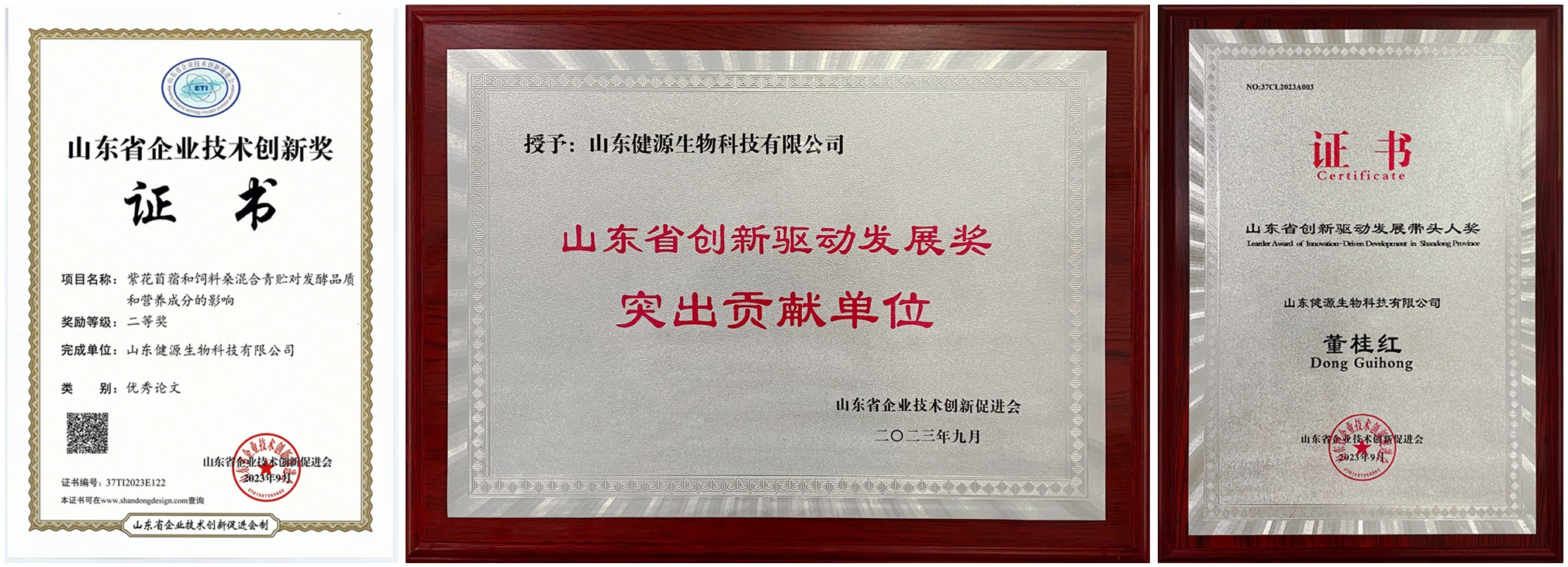 祝贺山东健源生物科技有限公司荣获山东省创新驱动发展奖突出贡献单位《紫花苜蓿和饲料桑混合青贮对发酵品质...