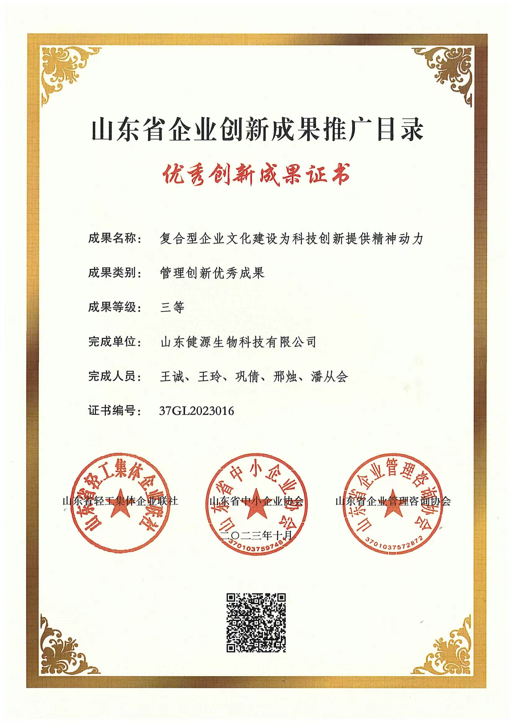 山东健源生物科技有限公司 “复合型企业文化建设为科技创新提供精神动力” 荣获管理创新优秀成果 三等...