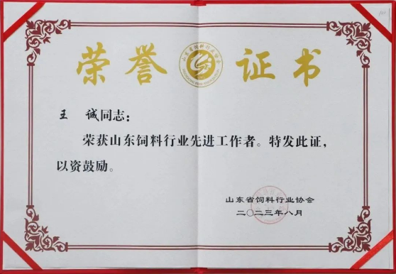 2023-9-2 山东健源生物董事长王诚荣获2023山东饲料行业先进工作者