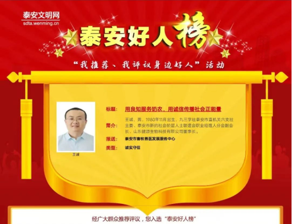 2022-7-7 热烈祝贺我公司王诚董事长接连入选“泰安好人榜”、“山东好人”均为诚实守信类