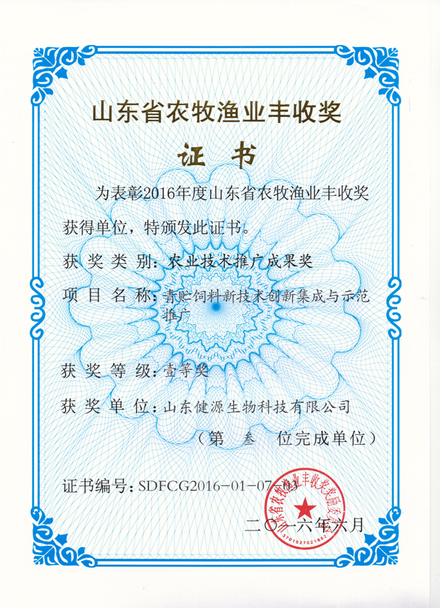 2016年8月17日,我们收到喜讯:健源生物以及公司总经理王诚分别荣获获得山东省农牧渔业丰收奖—...