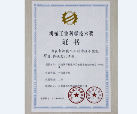 10月20日,中国机械工业联合会、中国机械工程学会发布了《关于表彰2022年度“机械工业科学技术奖”奖励项目的通报》文件,山东健源生物科技有限公司参与完成的《高效饲草料生产关键技术装备的研发与产业化》项目荣获2022年度机械工业科学技术奖“科技进步奖二等奖”。