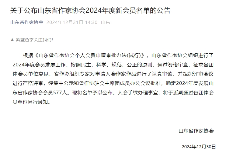根据《山东省作家协会个人会员申请审批办法(试行)》,山东省作家协会组织进行了2024年度会员发展工作。按照民主、科学、规范、公正的原则,通过资格审查、征求各团体会员单位意见,省作协组织专家对申请入会作家作品进行了认真审读,并组织评审会议进行严格评审,经集中公示和省作协驻会主席团成员办公会议批准,确定2024年度发展山东省作家协会会员577人。